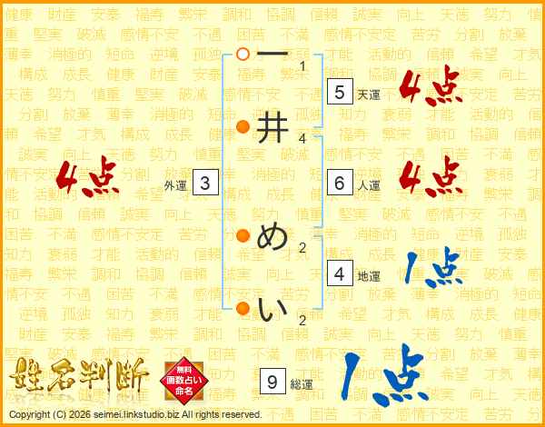 生活面を象徴する運勢です。外部から受ける影響力を表し、結婚運、家庭運や職場、環境への順応性を表します。総運から人運を引いた画数。姓や名が1文字の場合を除く。