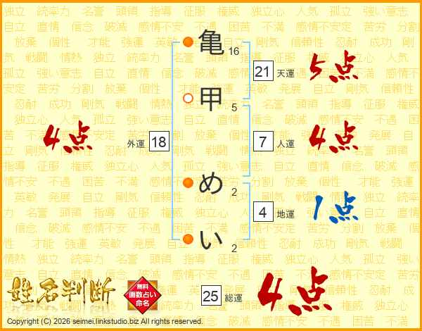 生活面を象徴する運勢です。外部から受ける影響力を表し、結婚運、家庭運や職場、環境への順応性を表します。総運から人運を引いた画数。姓や名が1文字の場合を除く。