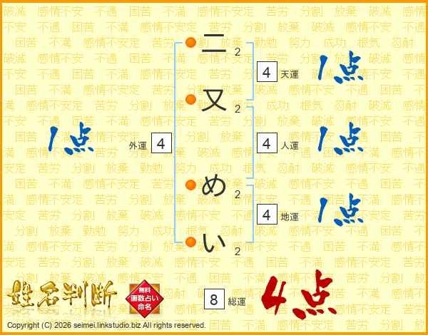 生活面を象徴する運勢です。外部から受ける影響力を表し、結婚運、家庭運や職場、環境への順応性を表します。総運から人運を引いた画数。姓や名が1文字の場合を除く。