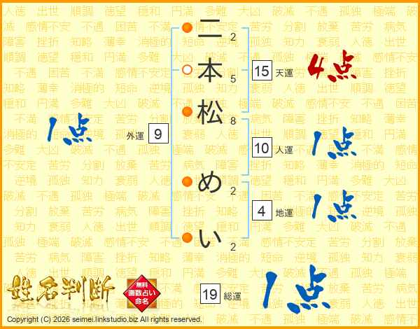 画数の奇数(○陽)と偶数(●陰)の配列で吉凶を占います。どちらかにかたよる名前は大凶名で避ける必要があります。画数の奇数偶数。