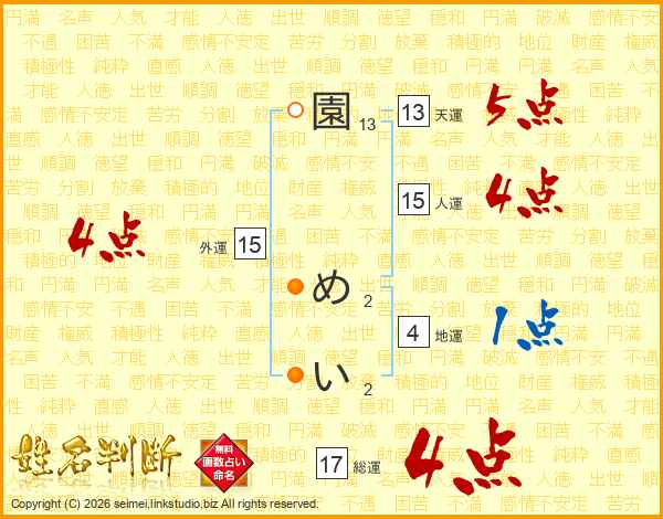 生活面を象徴する運勢です。外部から受ける影響力を表し、結婚運、家庭運や職場、環境への順応性を表します。総運から人運を引いた画数。姓や名が1文字の場合を除く。