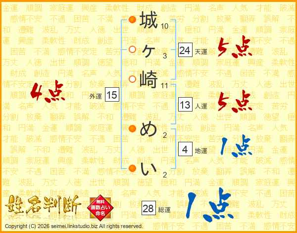 城(10画)ヶ(3画)崎(11画) め(2画)い(2画)