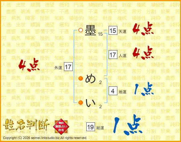 生活面を象徴する運勢です。外部から受ける影響力を表し、結婚運、家庭運や職場、環境への順応性を表します。総運から人運を引いた画数。姓や名が1文字の場合を除く。