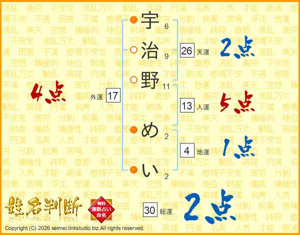 宇(6画)治(9画)野(11画) め(2画)い(2画)