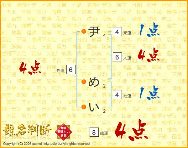 生活面を象徴する運勢です。外部から受ける影響力を表し、結婚運、家庭運や職場、環境への順応性を表します。総運から人運を引いた画数。姓や名が1文字の場合を除く。