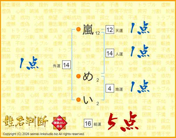生活面を象徴する運勢です。外部から受ける影響力を表し、結婚運、家庭運や職場、環境への順応性を表します。総運から人運を引いた画数。姓や名が1文字の場合を除く。