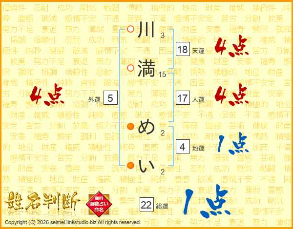 生活面を象徴する運勢です。外部から受ける影響力を表し、結婚運、家庭運や職場、環境への順応性を表します。総運から人運を引いた画数。姓や名が1文字の場合を除く。