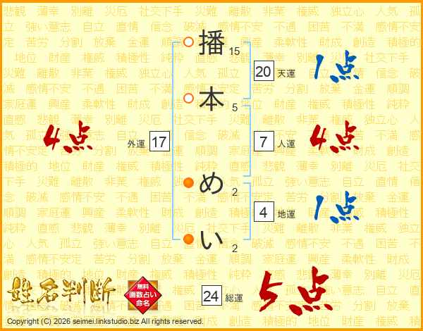 生活面を象徴する運勢です。外部から受ける影響力を表し、結婚運、家庭運や職場、環境への順応性を表します。総運から人運を引いた画数。姓や名が1文字の場合を除く。