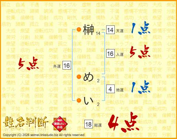 あなたの人生を表す1番重要な運勢です。生涯を通じて影響する総合運となり、主に50歳以降の晩年期に影響を及ぼします。苗字と名前の合計画数。