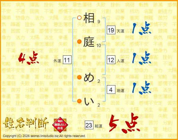 生活面を象徴する運勢です。外部から受ける影響力を表し、結婚運、家庭運や職場、環境への順応性を表します。総運から人運を引いた画数。姓や名が1文字の場合を除く。