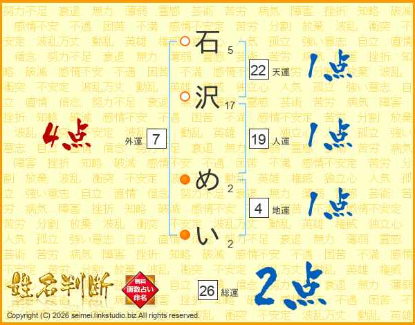 生活面を象徴する運勢です。外部から受ける影響力を表し、結婚運、家庭運や職場、環境への順応性を表します。総運から人運を引いた画数。姓や名が1文字の場合を除く。