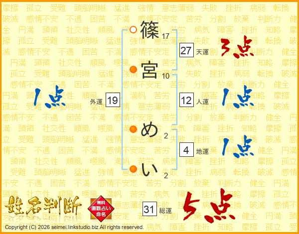 生活面を象徴する運勢です。外部から受ける影響力を表し、結婚運、家庭運や職場、環境への順応性を表します。総運から人運を引いた画数。姓や名が1文字の場合を除く。