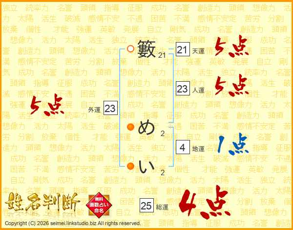 生活面を象徴する運勢です。外部から受ける影響力を表し、結婚運、家庭運や職場、環境への順応性を表します。総運から人運を引いた画数。姓や名が1文字の場合を除く。