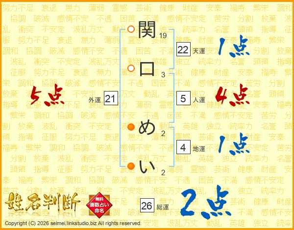 生活面を象徴する運勢です。外部から受ける影響力を表し、結婚運、家庭運や職場、環境への順応性を表します。総運から人運を引いた画数。姓や名が1文字の場合を除く。