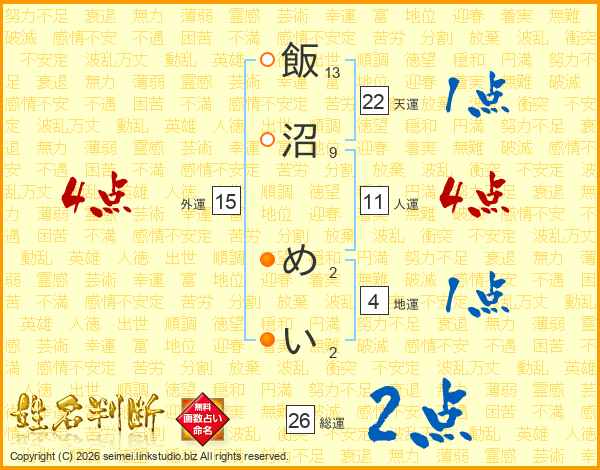 飯沼めいさんの総運は26画の2点!