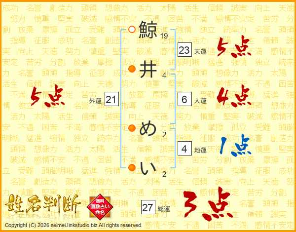 生活面を象徴する運勢です。外部から受ける影響力を表し、結婚運、家庭運や職場、環境への順応性を表します。総運から人運を引いた画数。姓や名が1文字の場合を除く。