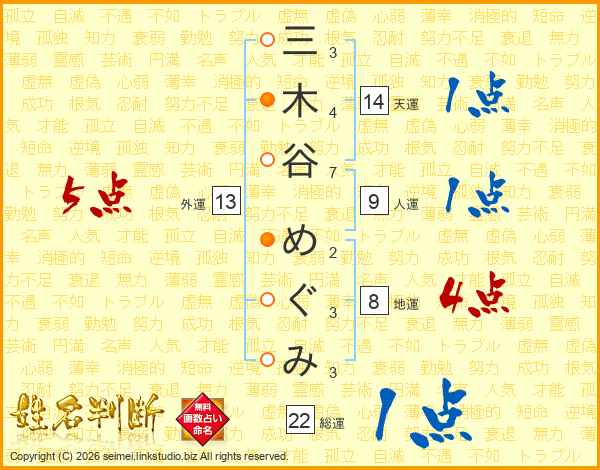 三木谷めぐみさんの総運は22画の1点!