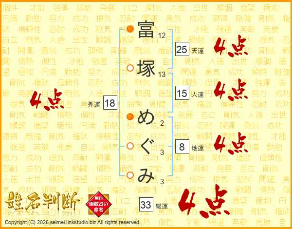 富(12画)塚(13画) め(2画)ぐ(3画)み(3画)