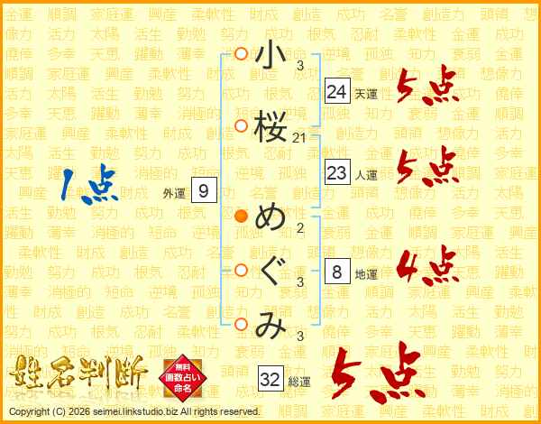小(3画)桜(21画) め(2画)ぐ(3画)み(3画)