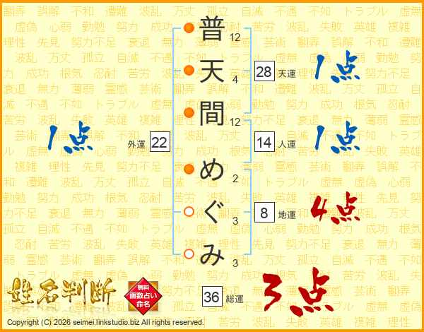 普(12画)天(4画)間(12画) め(2画)ぐ(3画)み(3画)
