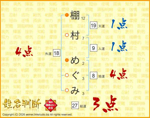 棚(12画)村(7画) め(2画)ぐ(3画)み(3画)