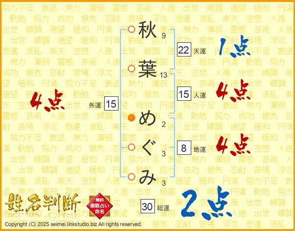 秋(9画)葉(13画) め(2画)ぐ(3画)み(3画)