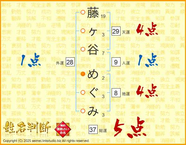 藤ヶ谷めぐみさんの総運は37画の5点!