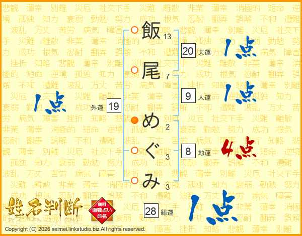 飯(13画)尾(7画) め(2画)ぐ(3画)み(3画)