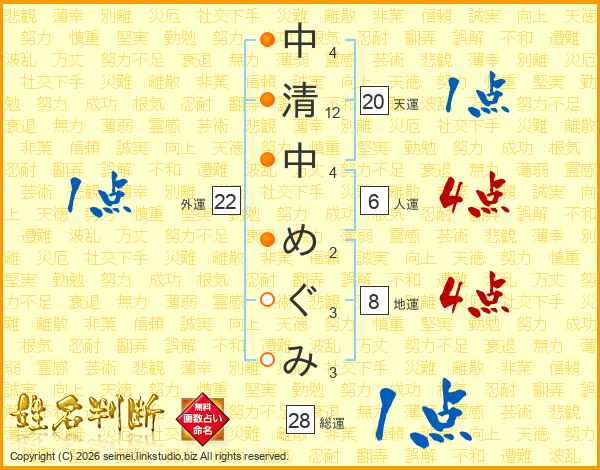 中清中めぐみさんの総運は28画の1点!