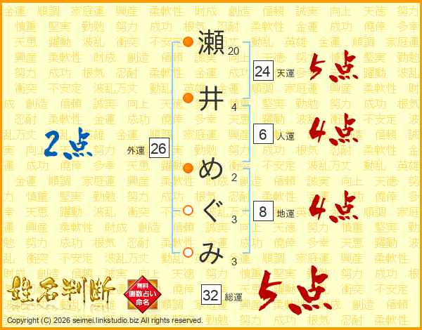 瀬井めぐみさんの総運は32画の5点!