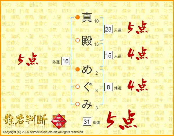 真(10画)殿(13画) め(2画)ぐ(3画)み(3画)