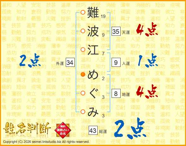 難(19画)波(9画)江(7画) め(2画)ぐ(3画)み(3画)