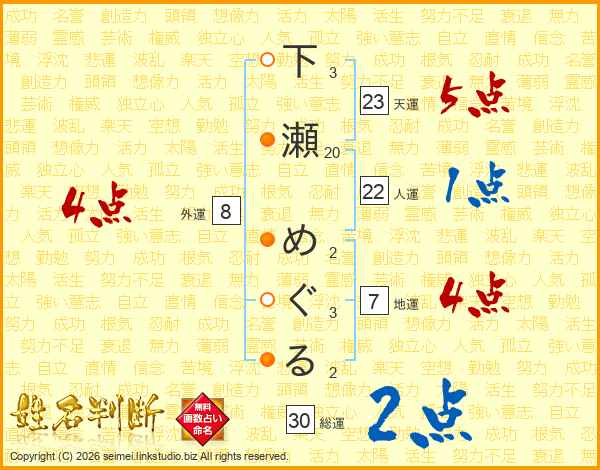 下(3画)瀬(20画) め(2画)ぐ(3画)る(2画)