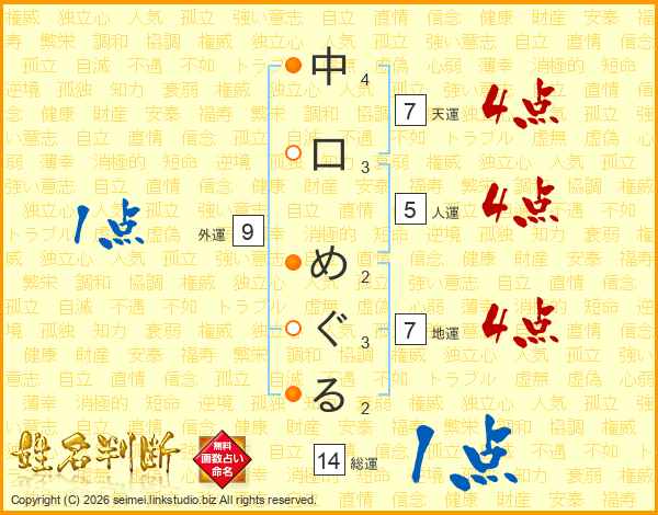 中口めぐるさんの総運は14画の1点!