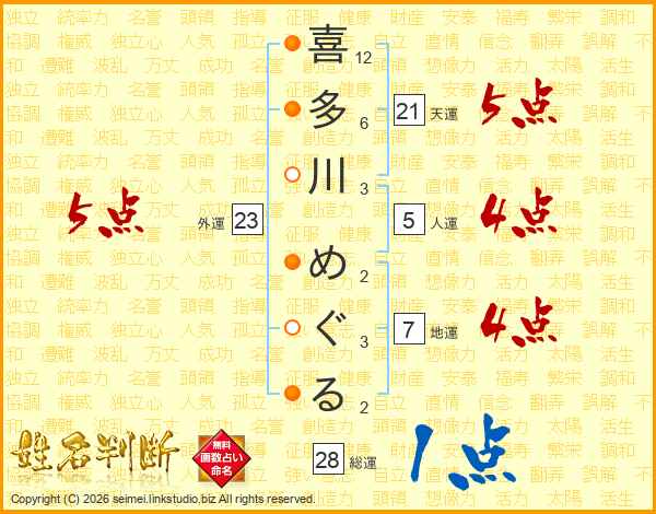喜(12画)多(6画)川(3画) め(2画)ぐ(3画)る(2画)