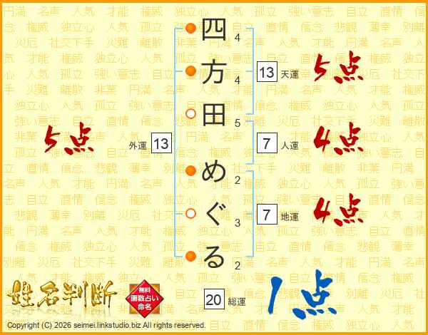 生活面を象徴する運勢です。外部から受ける影響力を表し、結婚運、家庭運や職場、環境への順応性を表します。総運から人運を引いた画数。姓や名が1文字の場合を除く。