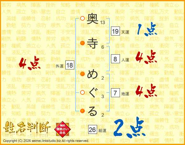 生活面を象徴する運勢です。外部から受ける影響力を表し、結婚運、家庭運や職場、環境への順応性を表します。総運から人運を引いた画数。姓や名が1文字の場合を除く。