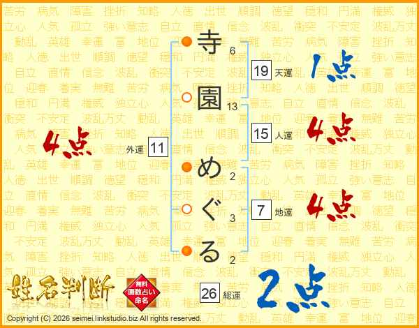 寺園めぐるさんの総運は26画の2点!