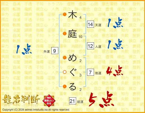 木庭めぐるさんの総運は21画の5点!