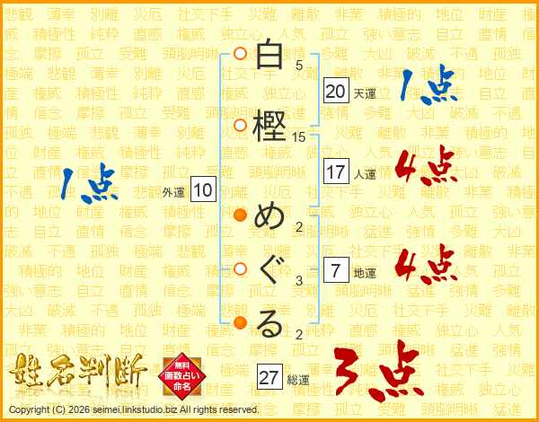 生活面を象徴する運勢です。外部から受ける影響力を表し、結婚運、家庭運や職場、環境への順応性を表します。総運から人運を引いた画数。姓や名が1文字の場合を除く。