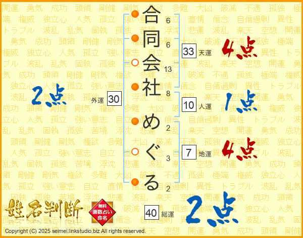 生活面を象徴する運勢です。外部から受ける影響力を表し、結婚運、家庭運や職場、環境への順応性を表します。総運から人運を引いた画数。姓や名が1文字の場合を除く。