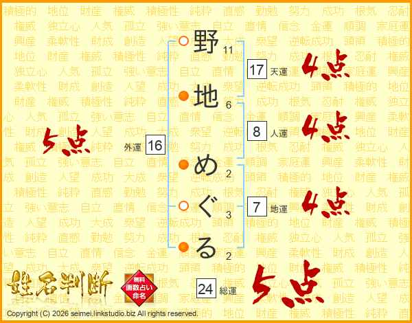 野地めぐるさんの総運は24画の5点!