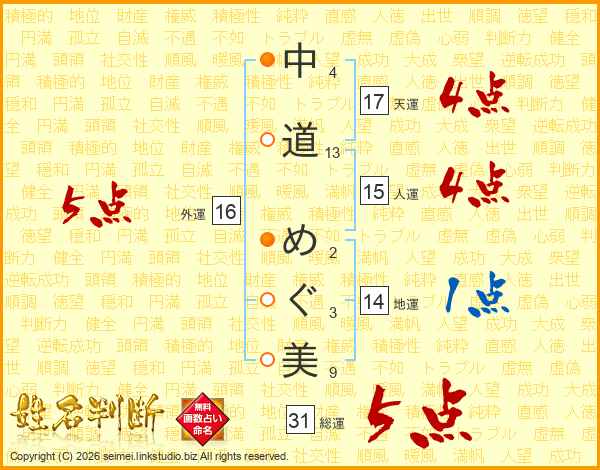 中(4画)道(13画) め(2画)ぐ(3画)美(9画)