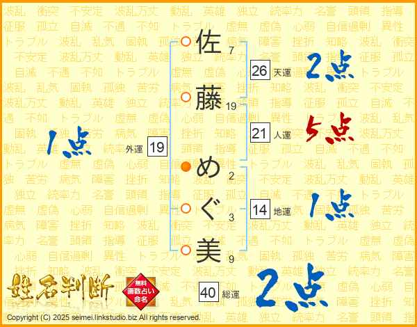 佐(7画)藤(19画) め(2画)ぐ(3画)美(9画)