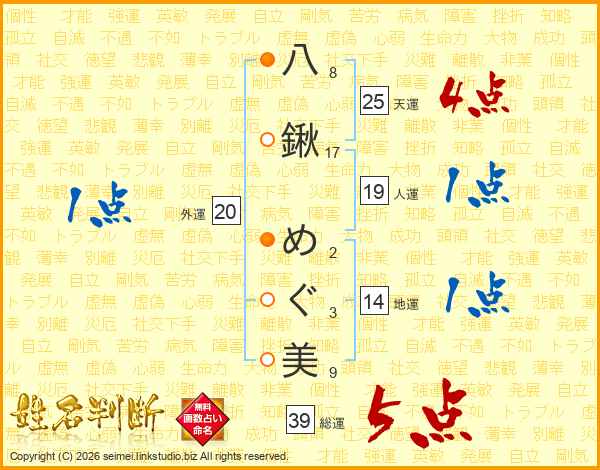 八鍬めぐ美さんの総運は39画の5点!