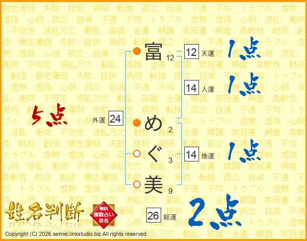 生活面を象徴する運勢です。外部から受ける影響力を表し、結婚運、家庭運や職場、環境への順応性を表します。総運から人運を引いた画数。姓や名が1文字の場合を除く。