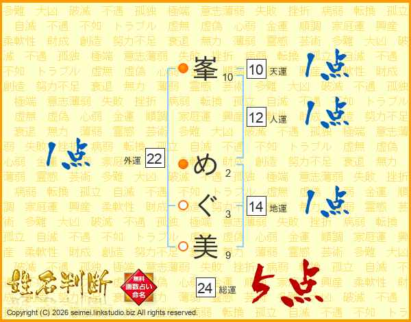 峯(10画) め(2画)ぐ(3画)美(9画)