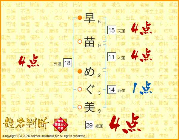 早苗めぐ美さんの総運は29画の4点!