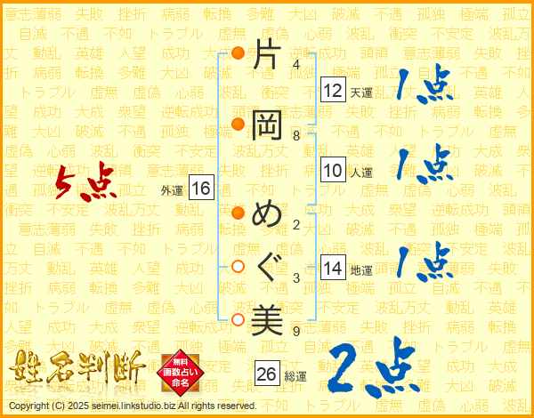 片(4画)岡(8画) め(2画)ぐ(3画)美(9画)