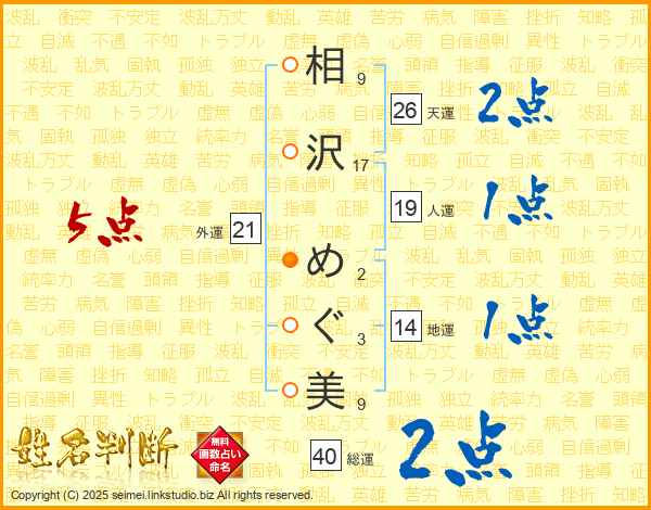 相(9画)沢(17画) め(2画)ぐ(3画)美(9画)